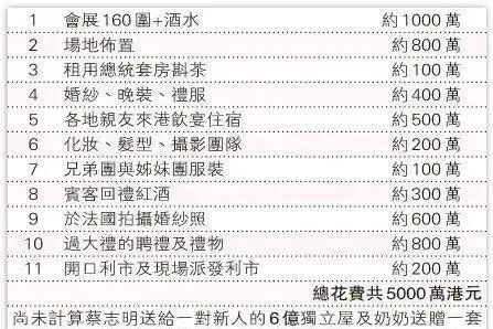 蔡家花费8亿港币,比当初李家诚家迎娶千亿儿媳徐子淇时还多了1亿港币。