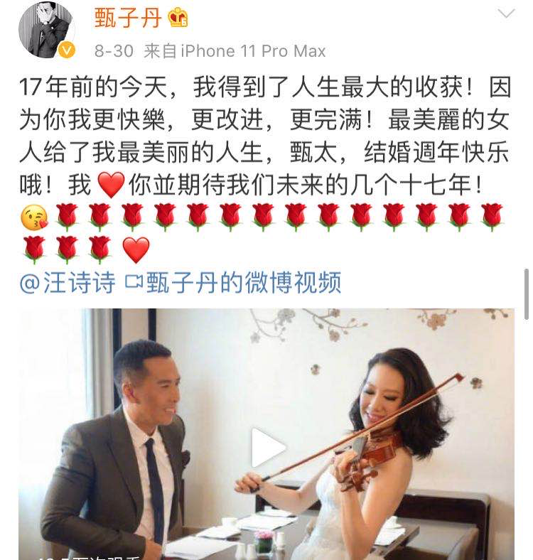 刚过去的一个月,甄子丹在微博写了一句话:17年前,我得到了人生最大的收获,并配出和妻子汪诗诗的合照。