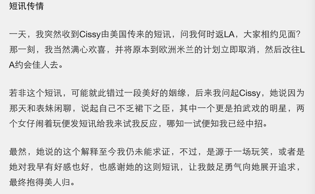 后来,在洛杉矶汪诗诗的又来了条短信,彻底让甄子丹对她展开追求: