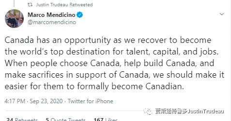 “在其他的国家拒绝世界范围内的人才帮助他们的经济时,加拿大将会有机会成为世界人才、资本、和工作机会的最佳目的地。当人们选择了加拿大,帮助建设加拿大,并且为支持加拿大而做出牺牲时,我们应该让他们更容易地正式成为加拿大人。”这是2020年9月23日,加拿大总督朱莉·帕耶特在国会再次复会后的施政演讲当中提到的关于建设一个更加包容的加拿大的部分。