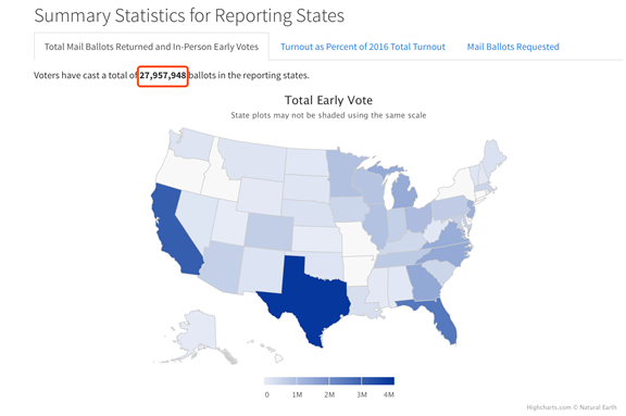 根据Github上美国大选项目提供的实时数据:截至目前,已经有27957948张,接近2800万张选票被选民寄出或投出。