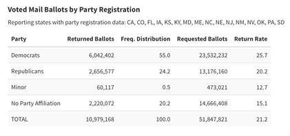 目前的态势是,返回的选票中,55%来自民主党,但只有24.2%属于共和党,还有20%来自无党派人士。