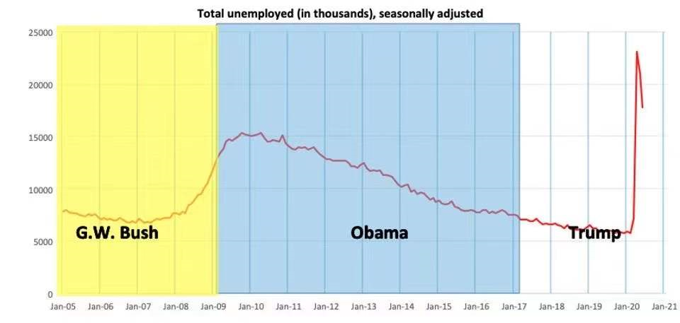这是从布什到奥巴马再到特朗普的失业率走势,奥巴马接手那年正好是金融危机。