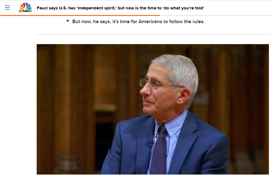 白宫新冠顾问福奇博士:美国人有独立精神,但现在还是应该听专家戴口罩