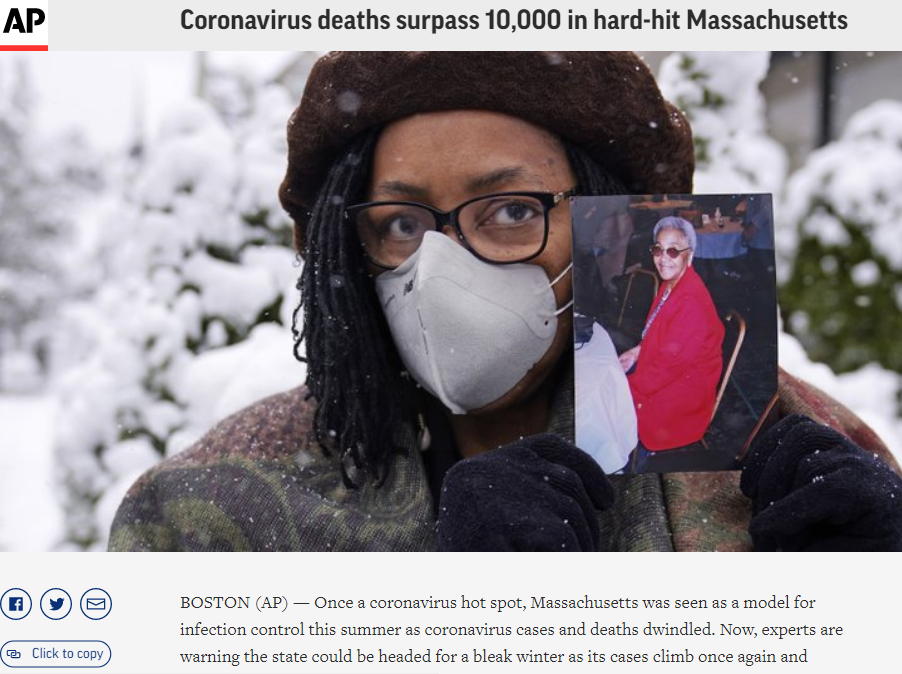 据美联社报道,马萨诸塞州曾在夏天被视为感染控制的典范,但现在专家警告说,随着病例再次攀升,确认死亡人数超过1万人,应该采取更加严格的封锁措施。