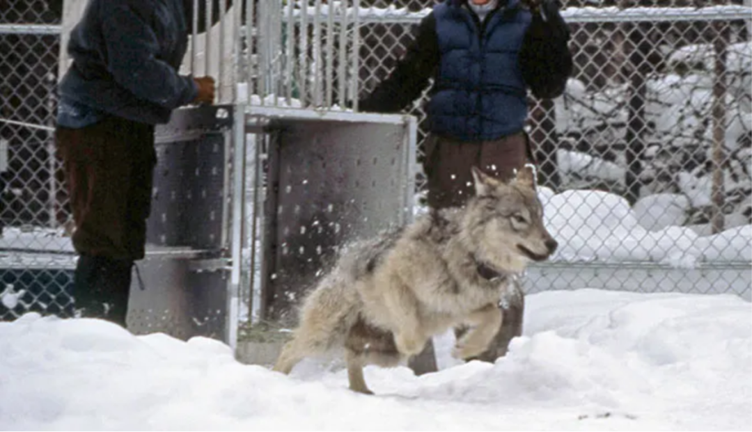 从加拿大运来的狼刚被从笼子里放出来。(图片来自黄石国家公园网站)