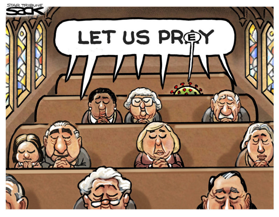 [此漫画中教众说让我们祈祷(Let Us Pray),而病毒潜伏着说我们来捕食Let Us Prey)]