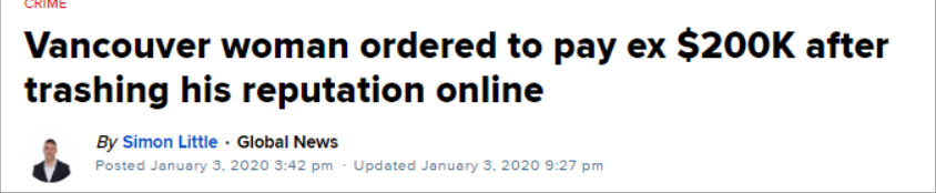“诽谤”是件严重的事。如果一个人针对另一个人的贬损性言论,会降低另一个人的社会评价,让他被仇恨、轻蔑、嘲笑、恐惧、厌恶、不被尊重。那这就是诽谤。诽谤可以是故意的也可以是过失的。但一旦被法庭认为是故意的,恶意的,那,惩罚性赔偿就可怕了。法官判姑娘付给前男友巨额赔偿一共23万加元,估计姑娘再工作十年也还不清,一套公寓的首付没有了!