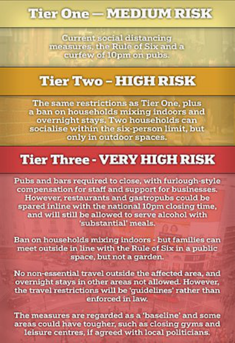 英格兰的新“三级”系统将把国内区域分为中,高,超高风险地区三类。