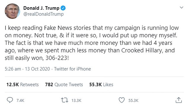 据外媒报道,美国总统唐纳德·特朗普向他的支持者保证,他的竞选资金没有告罄,如果真的出现这种情况,他会动用自己的资金。昨晚,特朗普在推特上向他的粉丝们保证,他的竞选资金已经充足,他仍然有信心赢得11月3日的选举。特朗普写道:“我一直在读一些假新闻,说我的竞选资金快用完了。不是这样的,如果是这样的话,我自己就出钱了。事实是,我们比4年前有钱多了,而4年前我们花的钱比狡诈的希拉里少多了,但我们还是以306票对223票轻松获胜。”