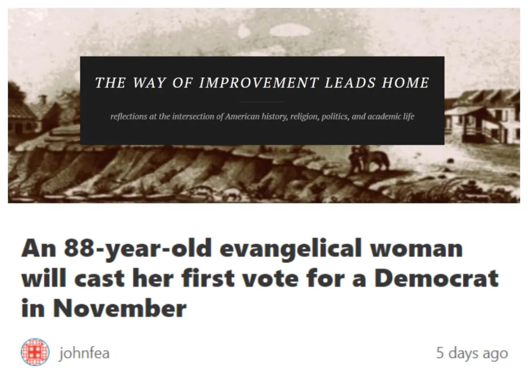 1.https://thewayofimprovement.com/2020/10/07/an-88-year-old-evangelical-woman-will-cast-her-first-vote-for-a-democrat-in-november/amp/?__twitter_impression=true