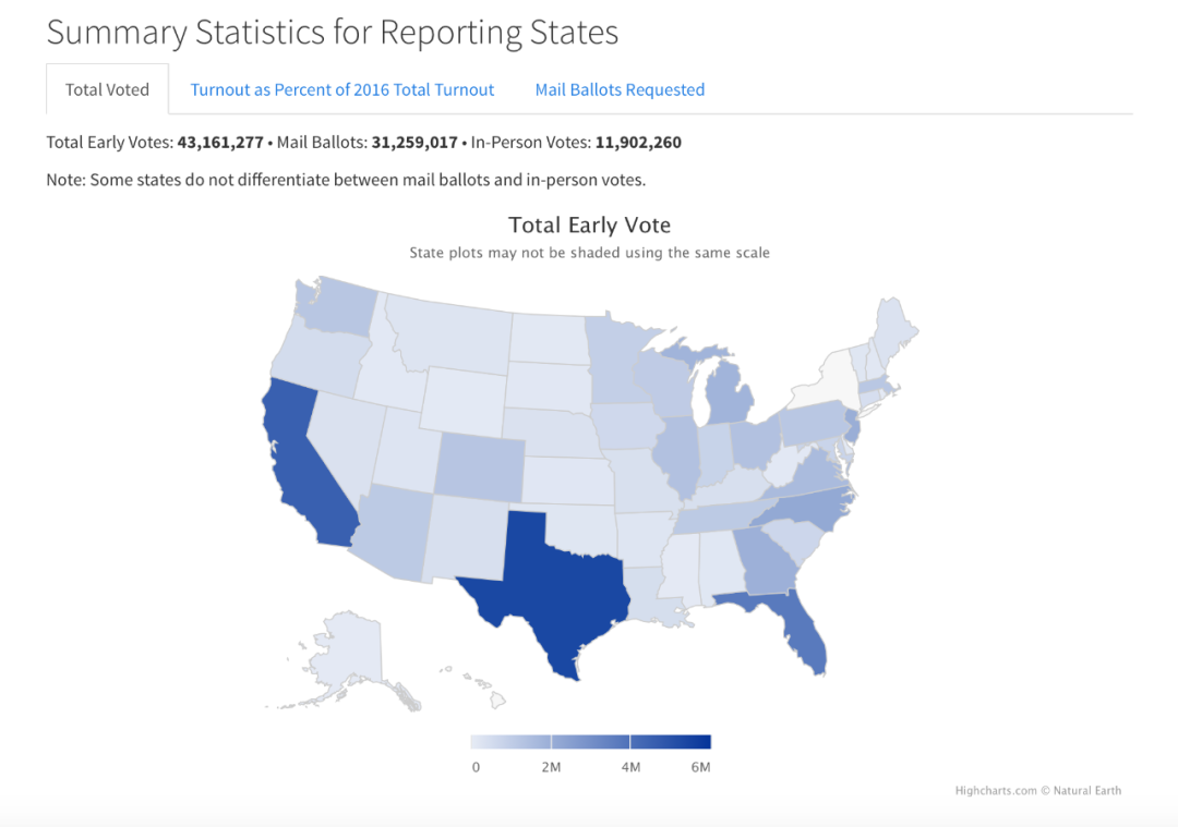 截至本周三,美国已经投票的人数超过了4316万人,其中略多于1190万人是现场投票,而略少于3126万人是通过邮寄返回的选票。
