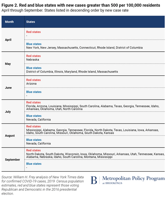 此外,华盛顿邮报在今年9月16日发布的一篇分析文章中提到,红州在那时已经出现了超过90000个死亡病例。截止9月28,特朗普在2016大选中拿下的30个红州总计出现了97329个死亡病例。