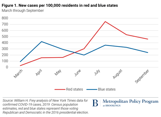 根据Brookings发布的统计报告,从美国红、蓝州每10万居民之中新增病例对比图中可以看出,自从6月特朗普呼吁各州开放经济以来,原本新增感染病例还位居蓝州之下的红州,每10万居民之中新增病例数开始一路飙升。