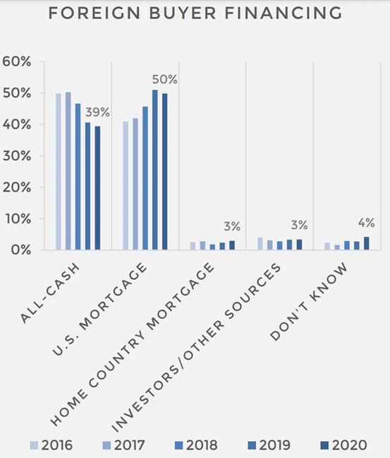 根据NAR发布的《美国住宅国际交易报告》数据显示:过去五年以来,现金全款购买美国住宅的海外买家比例逐年降低,从2016年的49%下降到2020年的39%。与之形成鲜明对比的是,使用美国抵押贷款的比例在上升。