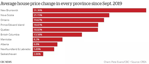 除此之外,新不伦瑞克省的平均房价较上年同期上涨31.36%,其次是新斯科舍省同比上涨21.5%,安省、爱德华王子岛以及魁北克省,平均房价涨幅都超过了18%。