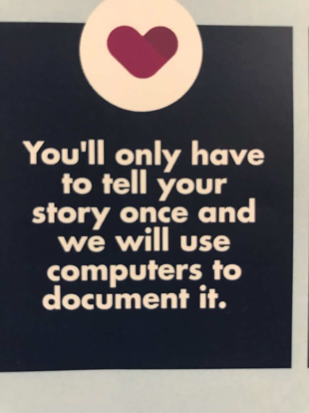 在第一天的下午,我迎来了我住院以后的第一次会诊,到场的有医生、护士、社工还有实习医生等等,总之阵式很大,有点多对一面试的感觉,很让人紧张,尽管医生肯定会尽量通过话术、情绪渲染等方式让会诊有一个轻松的氛围。会诊的内容大概就是重新再问一大堆已经问过无数遍的问题:来这里之前的情况,现在的感受,有没有自残和伤害他人的想法等等。一想到在充电台边上的宣传海报上赫然写着“We won’t need you to tell the same story again“,也是十分的讽刺,实际上每次不同医生会诊都会把差不多的问题再问一次,我总共被问了四五遍不止。