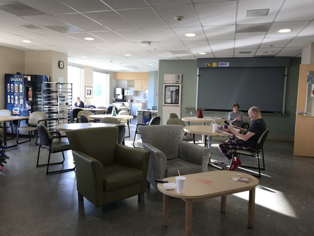 起床不久他就讲了一句很经典因此我至今记忆尤新的话“Nothing makes me feel more like a human than a good shower in the morning“。或许洗澡这种最原始最本能的放松调节活动对于无法控制自己情绪的病人来说也算是生活里不多的快乐来源了吧。洗澡过后他带我去就餐区取餐,每个人的餐都是不一样的,可能和服药情况有关。吃饭的地方同时也是公共休闲区,有电视,乒乓球台子,杂志和桌游等。手机是可以随身携带的,但是充电器在入院时候就被统一收走,在住院区充电需要去专门的地方。(收充电器是因为充电器算尖锐金属,属于危险物品)