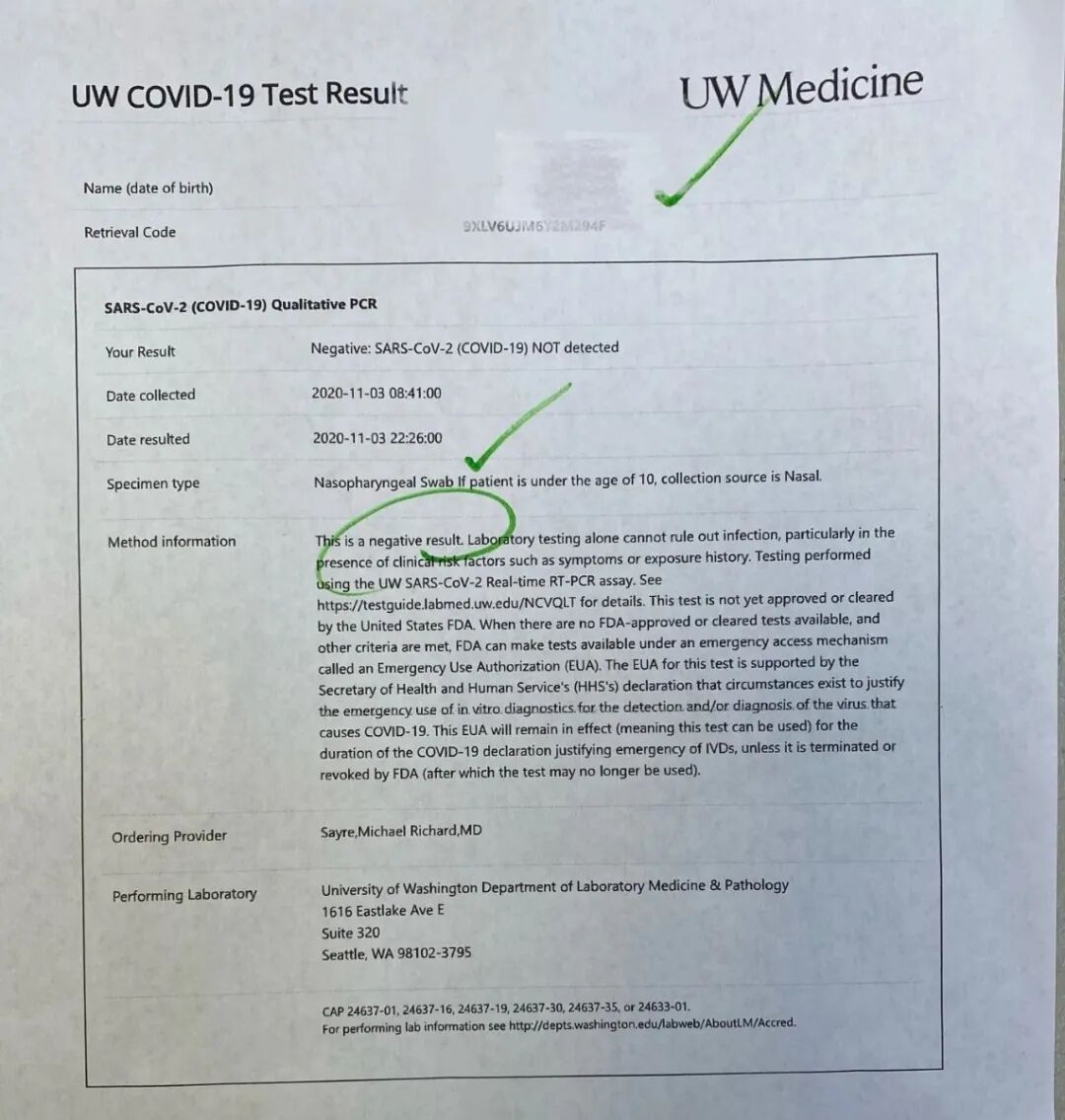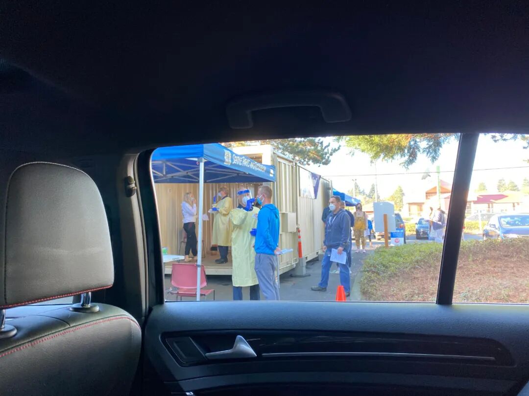 回家的路上,心情大好。于是就带妻子到我前些天跑步经过的几处,枫叶红、黄透了的地方去赏枫。 西雅图的秋,大美! 赏枫后,又带妻子到BURGER MASTER 吃汉堡。这家名店也是在车上完成点单、收货并可以当场在车里吃完,方便至极!她是第一次来这家店,评价不错。 就等着明天或后天能收到检测报告了。 平时我上床就能睡着,一睁开眼睛就是早晨8、9点钟了。这天,半夜3点就醒了。打开手机想看看结果出来没?正常来讲,结果是出不来的,才过了十几个小时,还没到24小时呢。可当我打开手机,进入网站后发现:检测结果竟然出来了,出具报告的时间是:11月03日01:39。 完了!这个结果早了8个半小时,白做了! 之前我所担心的所有问题都是:报告出晚了该怎么办?采取的备用措施也都是应对报告出晚了的。但万万没想到-报告出早了! 我赶紧叫妻子起床,告诉她报告出早了!迷迷糊糊的她瞬间清醒了。 我们赶紧下楼,到台式电脑前重新预约。我之前去的那个检测点,今、明两天都没有位置了;而离家较远点的另一个检测点还有位置,抓紧填表预约。 Your visit has been confirmed at City of Seattle Rainer Beach Site on Tue,Nov 3rd at 9:43 AM,预约成功! 这时是3日早晨5:59。 快速查谷歌地图:从家到检测点需要35分钟。 简单地吃过早餐后,我们决定8点就提前出发。因外面下着大雨,担心路上出状况,晚点可就坏了。 由于我们是两人乘一台车,可以在高速的快车道上行驶,一路的堵车也就基本与我无关了,8点30分就到达核酸检测点了。这次的检测是Walk Up的,即需要步行过去。 停好车,看到工作人员刚开始做准备工作。我问了一下,8点35分开始,我的预约时间是9:43。但工作人员告诉我,既然到了,可以提前做。于是走进采样室,与前台工作人员核对个人信息。我反复与她讲:我将要国际旅行,时间很紧,想知道什么时间能出结果?她反复回答,他们从不承诺时间。
