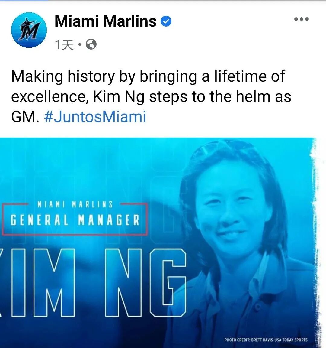 华裔女子伍佩琴(Kim Ng),被美国职业棒球大联盟(MLB)的迈阿密马林鱼队(Miami Marlins)聘用为总经理。