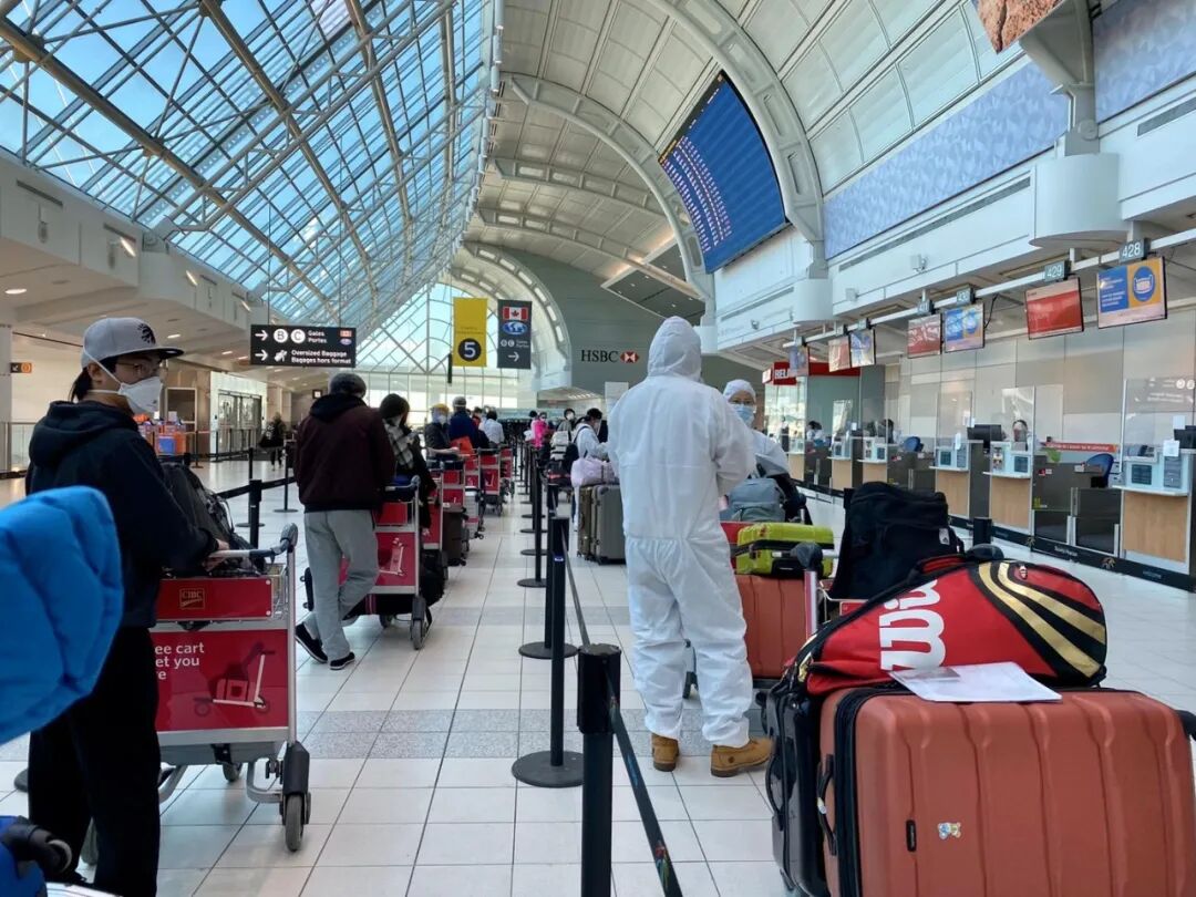 五个小时后到达多伦多皮尔逊国际机场,直抵T3航站楼,开始全程戴口罩。进入大厅空空荡荡,值机柜台空无一人,大屏幕显示HU7969在4号柜台办理,快到4号柜台时,已经看到有密集的排队人群,一定是海航柜台了。值机人员全副武装严阵以待,人们有序排队等候。值机开始,先测体温,后收双阴检测报告,办理登机、托运行李,手机扫二维码,填写健康申报信息,形成自己的健康二维码,截屏留存,以备登机和入境时使用。值机完毕,与女婿告别,他还要辛苦地再开500多公里回到蒙特利尔,互道珍重,祝福一路平安!