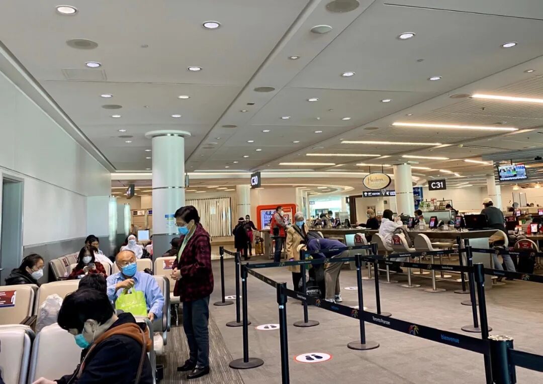 C30候机厅已经坐满了人,按要求隔空一个座椅而坐。清一色中国人,只看到一个老外候机,还被称为“外国人”,中国人到反客为主了。老年人很多,基本上都是来照顾孙子辈的,真是不远万里不辞劳苦的奶奶姥姥大军。3:30开始登机,第一拨轮椅者先行,十多台轮椅呼啦啦摆开两列,颤颤巍巍的老人们被工作人员推着登机了,相比他们我感觉年轻起来。第二拨商务舱乘客登机,看着他们轻松自如地带有一些骄傲神情的走进机舱,相比他们我钱袋瘪了一些。接下来按座位顺序由后向前分三拨登机,机舱里空姐们也是全副武装,根本看不到她们美丽的容颜。按防控要求,上座率不得超过70%,乘客之间隔一个座椅而坐,这就明白了票价之所以贵的原因。