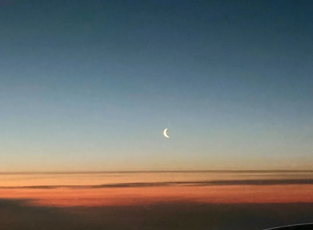 不知过了多久,我睁眼再看窗外,景色大变,天的尽头是橘红色的一片,我以为是太阳升起的地方,可分明有一镰弯月在上,那么美好地恬静地弯在那里,从来没见过这样的景色,很是激动,却没人分享……不知又过了多久,我更惊奇地发现,还是那橘红色的一片上面,弯月什么时候变成了满月?又惊又喜的我呆呆地独自观望着,可怜的一点点天文知识,怎么也解释不了这美丽的变幻……