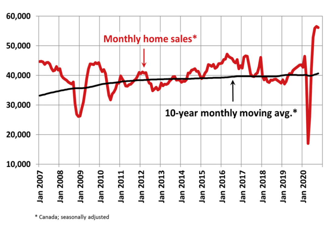自2007年以来加拿大房地产月度成交量走势。来源:加拿大房地产协会