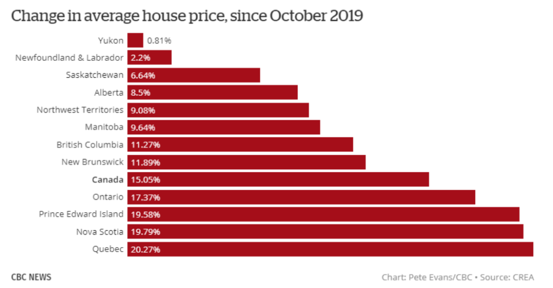加拿大全国及各地2010年10月房屋均价同比涨幅对比图。来源:CBC